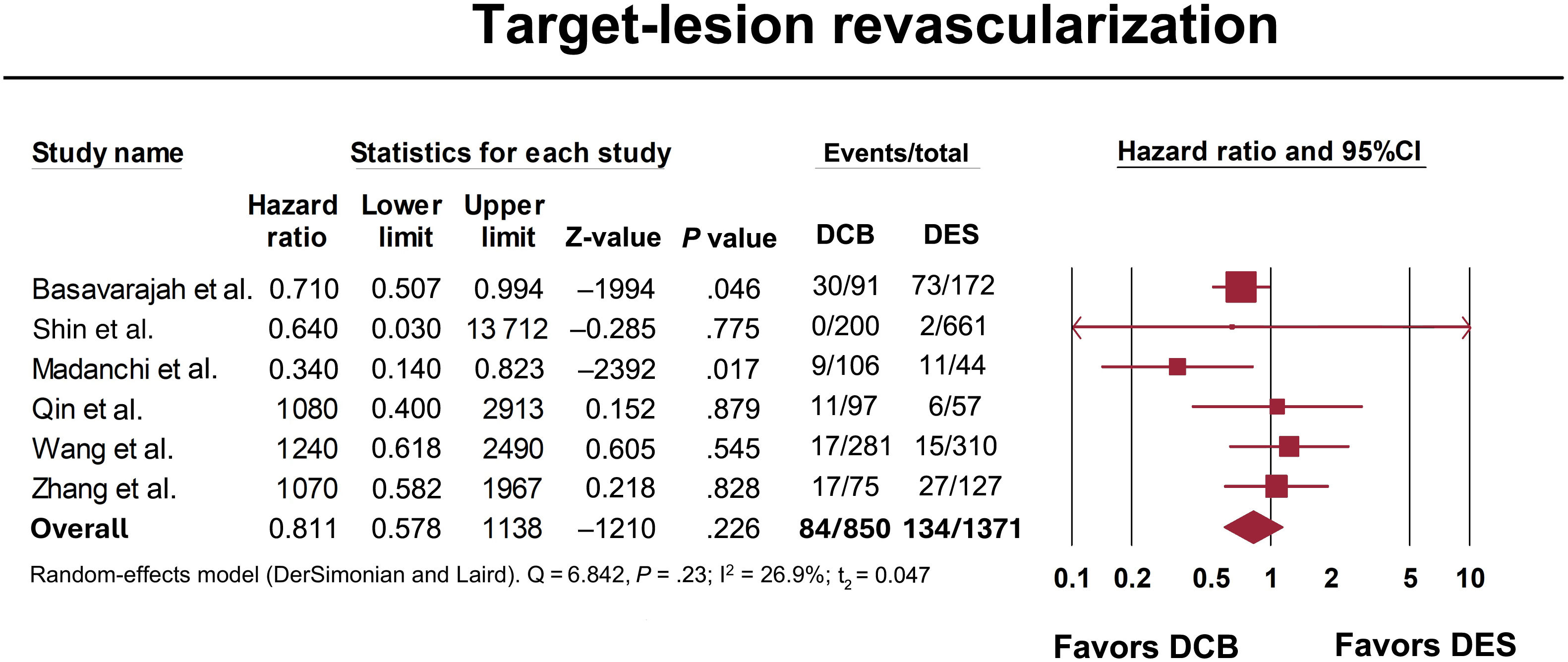 ResultsSix observational studies, including 2221 patients, met the inclusion criteria. After a median follow-up of 2.8 years, target lesion revascularization occurred in 9.9% of DCB-treated patients and 9.7% of DES-treated patients (HR, 0.81; 95%CI, 0.57-1.13; P=.22). Subgroup analysis showed no significant differences between de-novo and in-stent CTOs. The rates of secondary outcomes were comparable between the DCB and DES groups. On meta-regression analysis, advanced lesion preparation (with cutting balloons, intravascular lithotripsy, or rotational atherectomy) was associated with lower rates of target lesion revascularization (P=.02).
