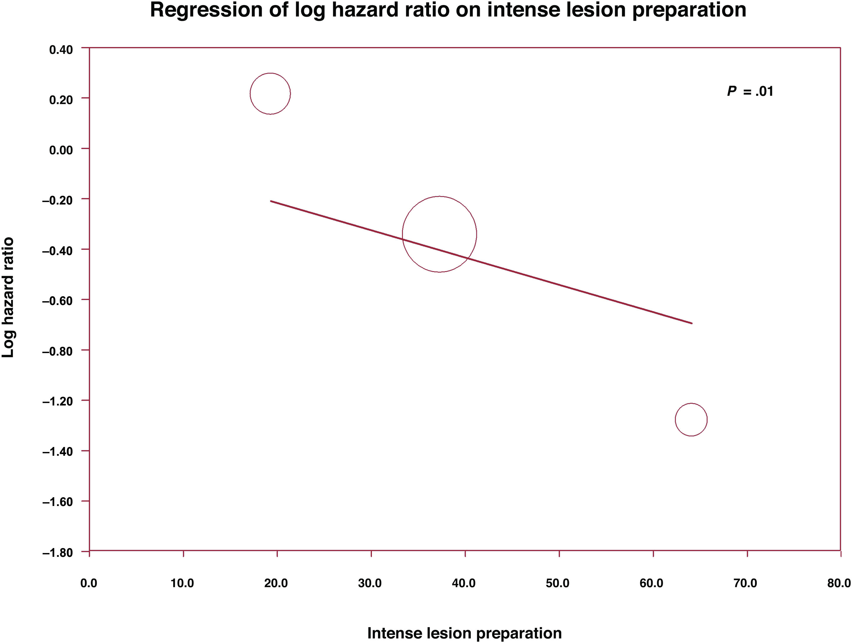 The median follow up was 2.8 years. Among the overall population analyzed, the primary outcome of TLR occurred in 218 patients (9.8%), with 84 patients (9.9%) in the DCB group and 134 patients (9.7%) in the DES group (HR, 0.81; 95%CI, 0.57-1.13, P=.22, figure 2). Meta-regression analysis showed a significant interaction of lesion preparation with plaque debulking (with cutting balloon, intravascular lithotripsy or rotational atherectomy) on the primary outcome (coefficient–0.01; 95%CI,–0.02 to–0.002; P=.02; figure 3). Meta-regression analyses according to DCB diameter and length, diabetes, J-CTO score, and length of follow-up did not show a significant association with the primary outcome (figure S1). Cochran's q test and I2 revealed no heterogeneity between the included studies (Cochran's Q 6.8; P=.23; I2=26). Leave one out and cumulative analysis confirmed the consistency of the results among studies (figures S2-S3).