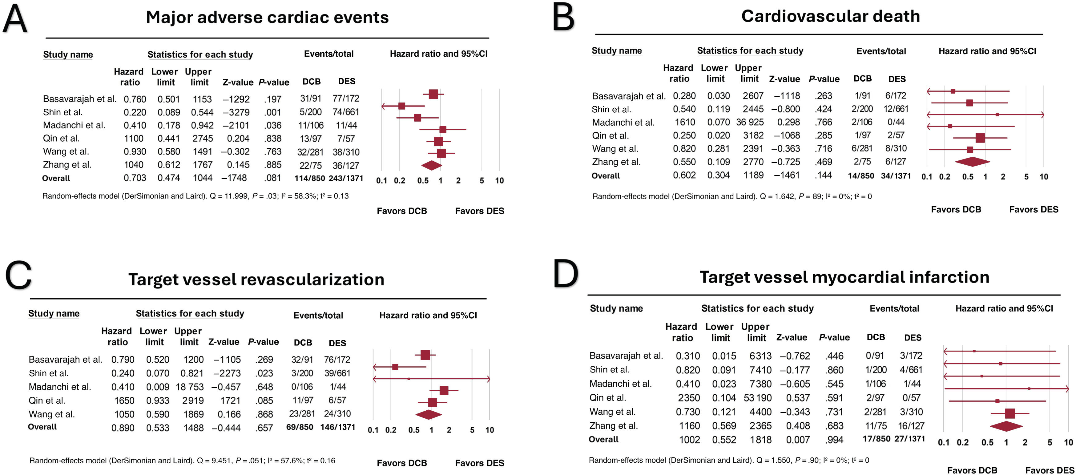 Forest plot of the secondary outcomes of major adverse cardiac events (A), cardiovascular mortality (B); target vessel revascularization (C), and target vessel myocardial infarction (D),16–21 95%CI, 95% confidence interval; DCB, drug-coated balloon; DES, drug-eluting stent. The bibliographical references mentioned in this figure correspond to: Basavarajaiah et al.,16 Zhang et al.,17 Qin et al.,18 Wang et al.,19 Madanchi et al.,20 and Shin et al.21.