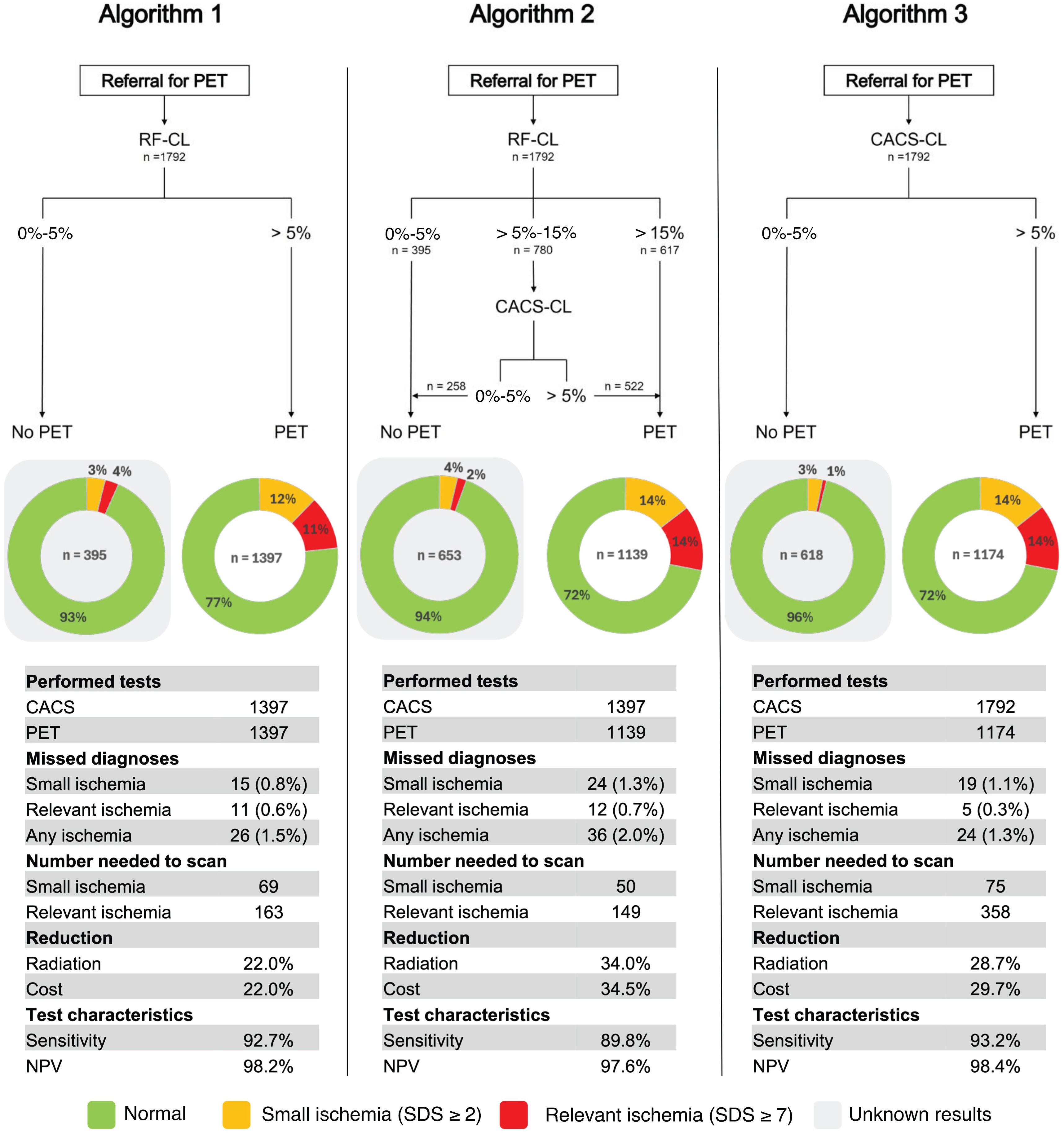 DISCUSSIONThe main findings of this study are as follows: a) All algorithms significantly reduced the number of normal scan results, radiation exposure, and health care costs, while maintaining good test characteristics and an acceptable rate of missed diagnoses. Notably, prognostically relevant ischemia was ruled out with a high degree of confidence (NPV> 99.3%). b) As reflected by the NNS of ≥ 149 for relevant ischemia, performing PET in all patients without preselection is highly inefficient and costly. c) Algorithm 2, was the most restrictive strategy, deferred the largest proportion of patients (36.4%). However, this approach compromised patient safety with a sensitivity of less than 90%, resulting in the highest rate of missed diagnoses. d) The best performance was observed with algorithm 3, which used CACS-CL in all patients for reclassification. More than one-third of patients were deferred, resulting in a significant reduction in normal scan results, radiation exposure, and costs while preserving patient safety.