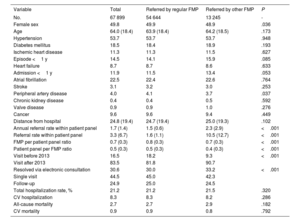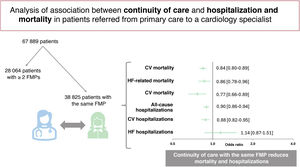 ResultsA total of 67 889 patients, referred from 2010 to 2023, were included, of whom 80.5% were referred by their FMP. Patients referred by an FMP other than their own had a higher annual referral rate (2.3 [2.9]) vs 1.5 [0.6]); P<.001) and were assigned to panels with a higher referral rate (10.5 [12.7] vs 1.6 (1.1]; P<.001). Patients referred by their FMP had a lower risk of overall hospitalizations (OR, 0.90; 95%CI, 0.86-0.94), hospitalizations for cardiovascular causes (OR, 0.88; 95%IC, 0.82-0.95), all-cause mortality (OR, 0.84; 95%CI, 0.80-0.89), cardiovascular-related mortality (OR, 0.86; 95%CI, 0.78-0.96), and heart failure-related mortality (OR, 0.77; 95%CI, 0.66-0.89).