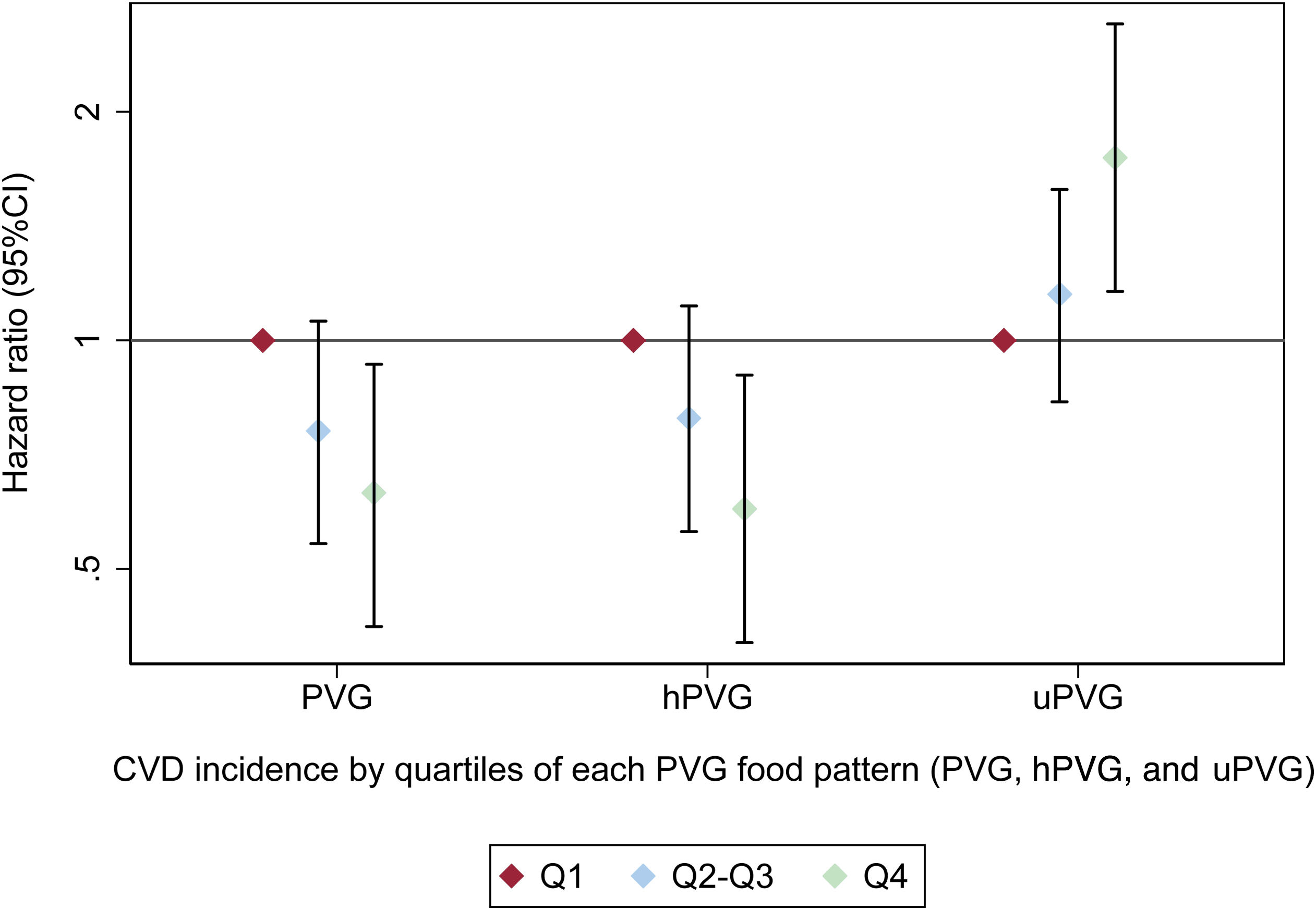 Cardiovascular disease incidence according to quartiles of each provegetarian food pattern. Adjusted for age, sex, body mass index, marital status, years of university education, physical activity, television watching, energy intake, cumulative smoking, smoking status, alcohol intake, special diet and snacking, cancer, diabetes, hypertension, hypercholesterolemia, hypertriglyceridemia, cardiovascular drugs, and family history of CVD. 95%CI, 95% confidence interval; CVD, cardiovascular disease; hPVG, healthful provegetarian; PVG, provegetarian; Q, quartil; uPVG, unhealthful provegetarian.