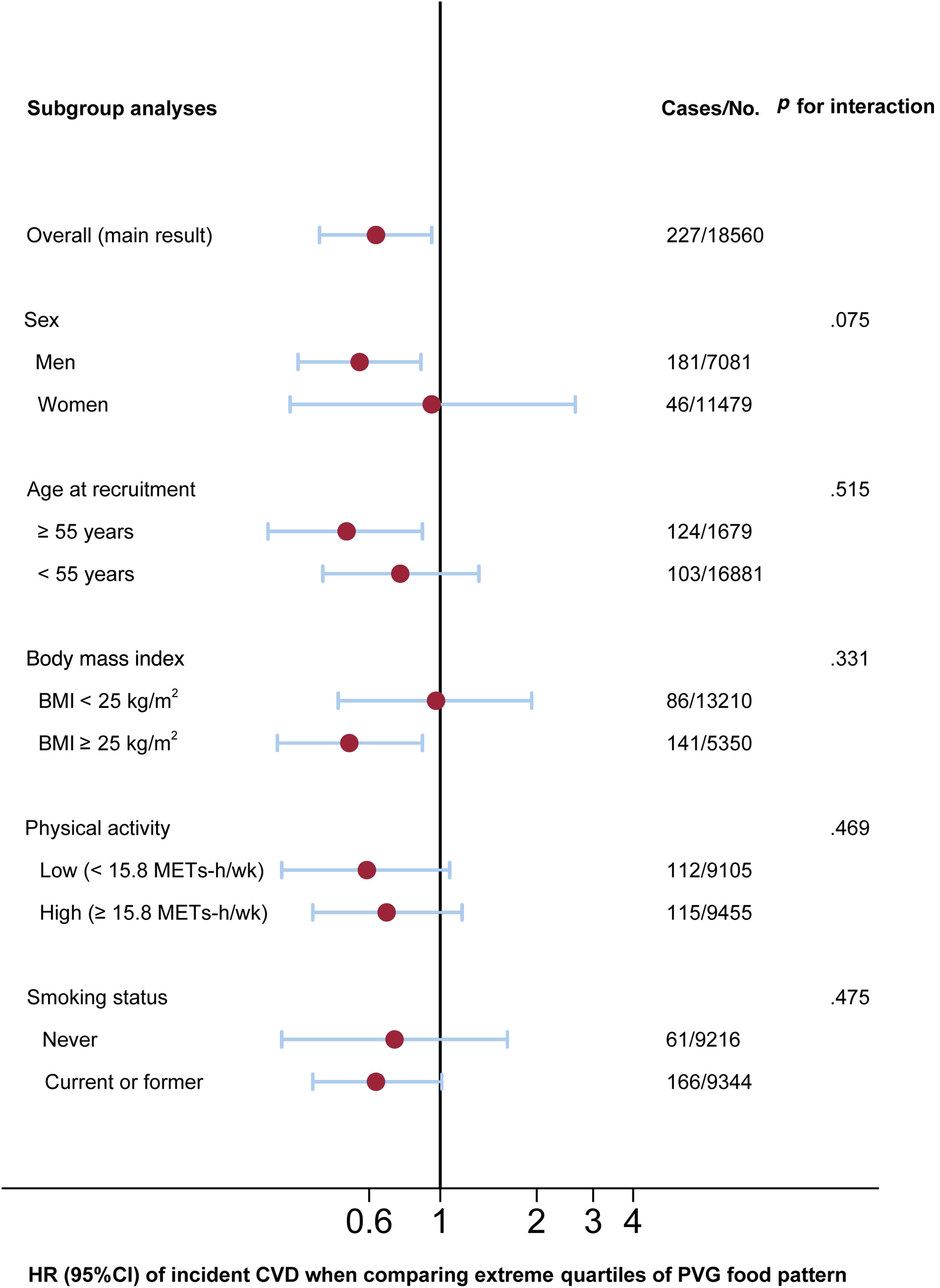 Subgroup analyses for the association between provegetarian food pattern and cardiovascular disease incidence. Adjusted for age, sex, body mass index, marital status, years of university, physical activity, television watching, energy intake, cumulative smoking, smoking status, alcohol intake, special diet and snacking, cancer, diabetes, hypertension, hypercholesterolemia, hypertriglyceridemia, cardiovascular drugs, and family history of CVD. 95%CI, 95% confidence interval; BMI, body mass index; CVD, cardiovascular disease; HR, hazard ratio; METs, metabolic equivalent of task; PVG, provegetarian.