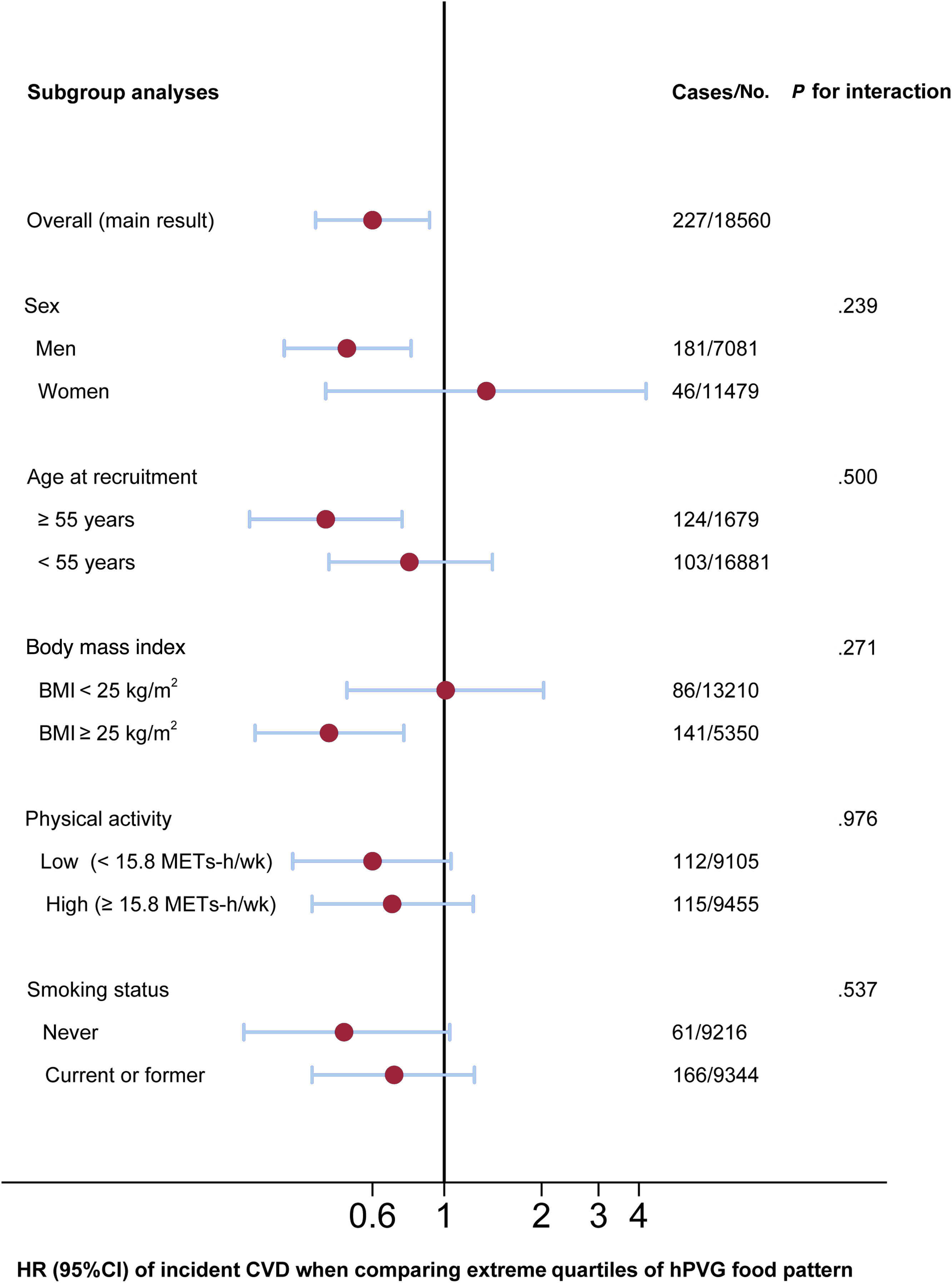 Subgroup analyses for the association between healthful provegetarian food pattern and cardiovascular disease incidence. Adjusted for age, sex, BMI, marital status, years of university, physical activity, television watching, energy intake, cumulative smoking, smoking status, alcohol intake, special diet and snacking, cancer, diabetes, hypertension, hypercholesterolemia, hypertriglyceridemia, cardiovascular drugs, and family history of CVD. 95%CI, 95% confidence interval; BMI, body mass index; CVD, cardiovascular disease; HR, hazard ratio; hPVG, healthful provegetarian; METs, metabolic equivalent of task.