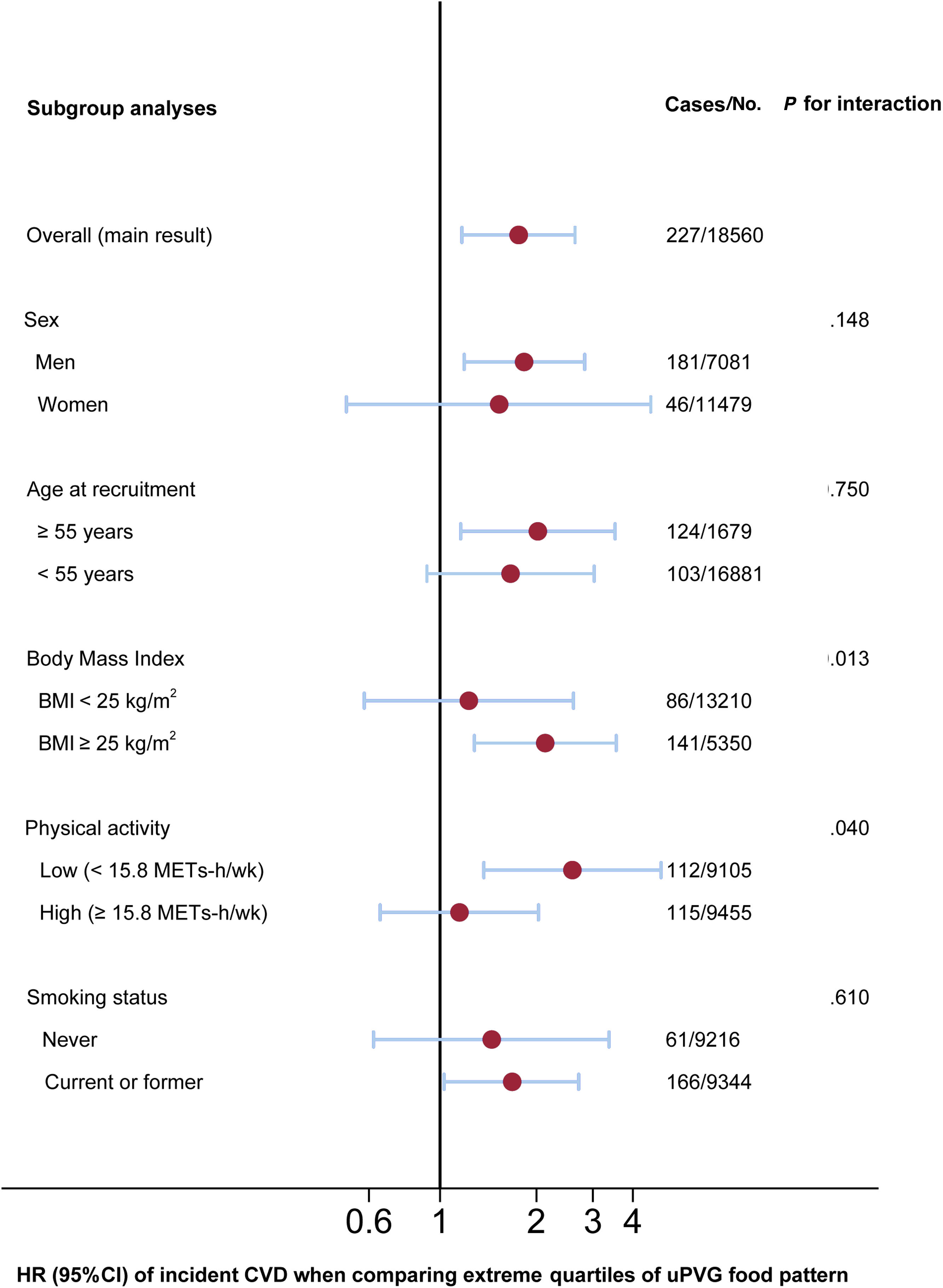 Subgroup analyses for the association between unhealthful provegetarian food pattern and cardiovascular disease incidence. Adjusted for age, sex, body mass index, marital status, years of university, physical activity, television watching, energy intake, cumulative smoking, smoking status, alcohol intake, special diet and snacking, cancer, diabetes, hypertension, hypercholesterolemia, hypertriglyceridemia, cardiovascular drugs, and family history of CVD. 95%CI, 95% confidence interval; CVD, cardiovascular disease; HR, hazard ratio; METs, metabolic equivalent of task; uPVG, unhealthful provegetarian.
