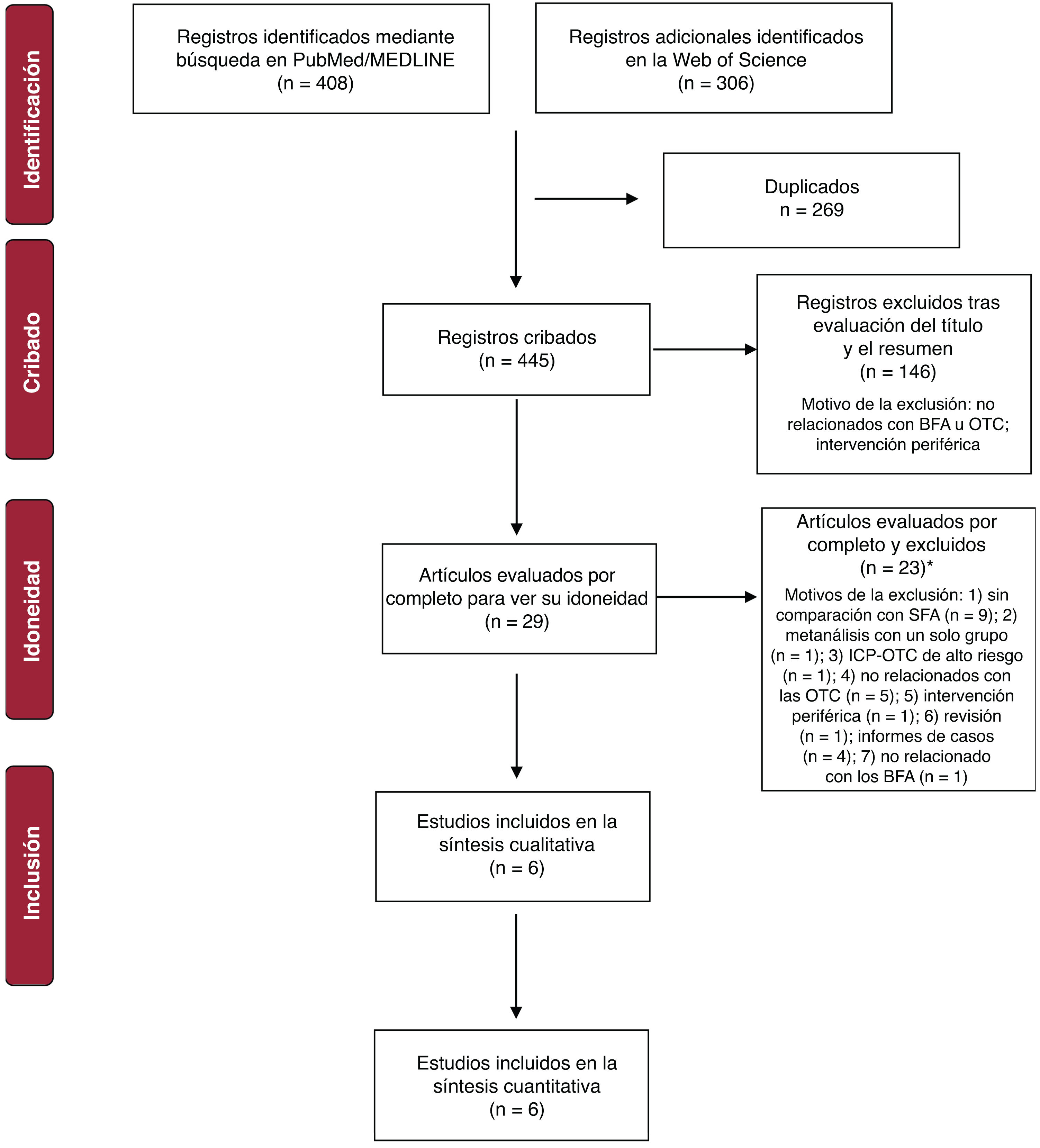 LimitacionesEste metanálisis tiene algunas limitaciones. En primer lugar, la mayor parte de los estudios incluidos eran observacionales, con diseños tanto prospectivos como retrospectivos. Como resultado, el riesgo inherente de sesgo sigue siendo considerable, ya que no se dispone de ensayos clínicos aleatorizados a gran escala, diseñados específicamente para comparar los BFA con los SFA en la ICP-OTC. Dado el número limitado de estudios incluidos, hay que interpretar con prudencia los resultados de la evaluación del sesgo de publicación. Por consiguiente, los resultados de este estudio pueden verse constreñidos por limitaciones metodológicas, y deben considerarse preliminares y generadoras de hipótesis. Estos problemas limitan la fuerza de las conclusiones comparativas e indican la necesidad urgente de ensayos aleatorizados bien diseñados para validar las estrategias con BFA en la ICP-OTC.