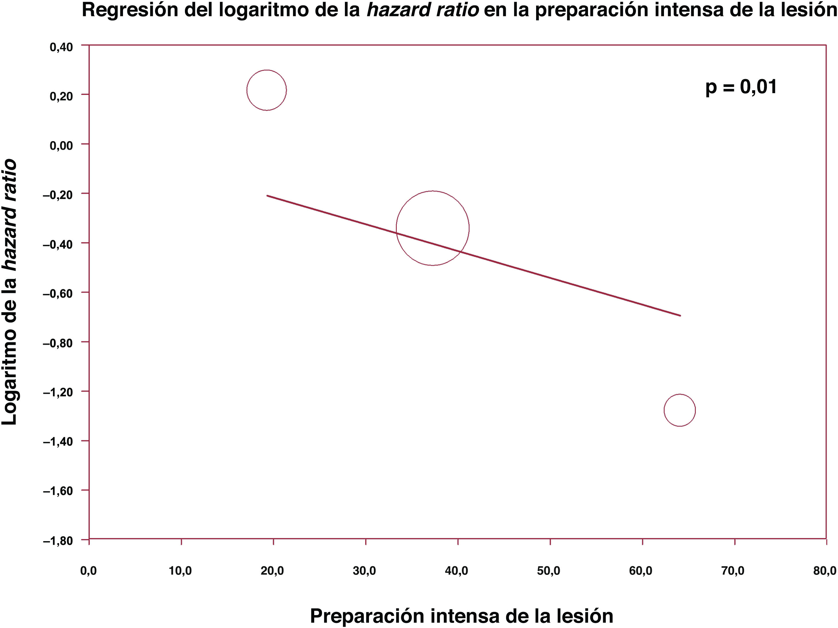 El seguimiento medio fue de 2,8 años. Entre toda la población analizada, el objetivo primario de RLD se dio en 218 pacientes (9,8%), con 84 (9,9%) en el grupo de los BFA y 134 (9,7%) en el de los SFA (HR= 0,81; IC95%, 0,57-1,13, p=0,22, figura 2). El análisis de metarregresión mostró una interacción significativa entre la preparación de la lesión y la citorreducción quirúrgica de la placa (con balón de corte, litotricia endovascular o aterectomía rotacional) en el objetivo primario (coeficiente–0,01; IC95%, –0,02 a–0,002; p=0,02; figura 3). Los análisis de metarregresión según el diámetro y la longitud del BFA, la presencia de diabetes, la puntuación J-CTO y la duración del seguimiento no mostraron ninguna asociación significativa con el objetivo primario (figura S1). La prueba Q de Cochran y el I2 no revelaron heterogeneidad entre los estudios incluidos (Q de Cochran = 6,8; p=0,23; I2=26). El análisis de exclusión y el acumulativo confirmaron la consistencia de los resultados entre los estudios (figuras S2-S3).