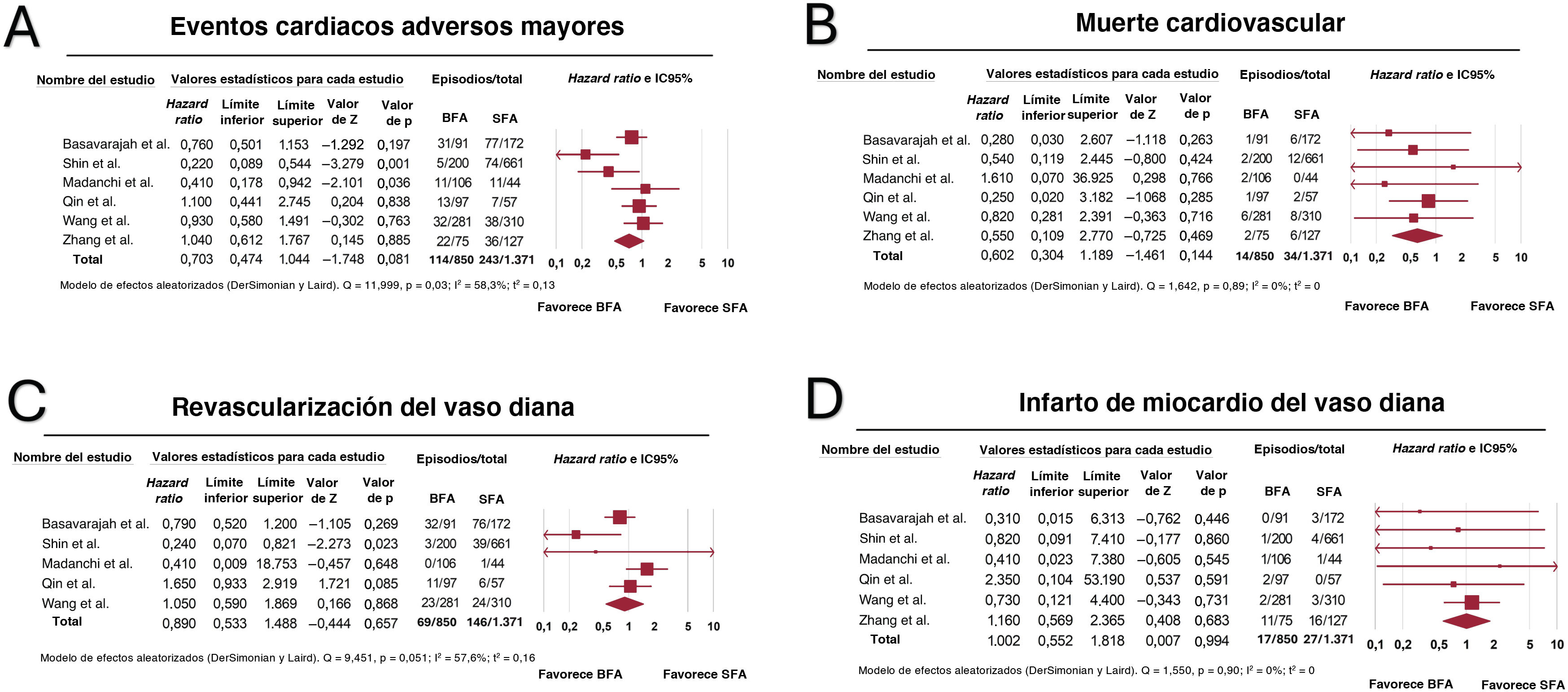 Gráfico de bosque de los objetivos secundarios: eventos cardiacos adversos mayores (A), mortalidad cardiovascular (B), revascularización del vaso diana (C) e infarto de miocardio (D)16–21. BFA: balón farmacoactivo; IC95%: intervalo de confianza del 95%; SFA: stent farmacoactivo. Las referencias bibliográficas mencionadas en esta figura corresponden a: Basavarajaiah et al.16, Zhang et al.17, Qin et al.18, Wang et al.19, Madanchi et al.20 y Shin et al.21.