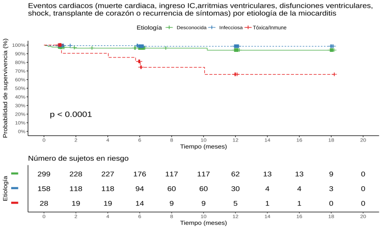 Conclusiones: En una gran cohorte de pacientes con miocarditis se observó que los pacientes presentan características y evolución clínica diferentes en función de la causa, siendo las miocarditis de etiología tóxica o inmune de peor pronóstico en comparación con el resto de causas.