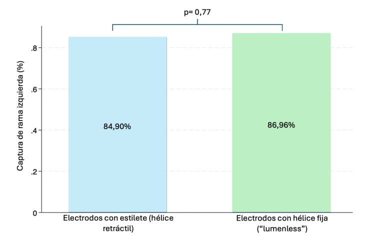 Introducción y objetivos: La estimulación del área de rama izquierda se ha consolidado como una alternativa para la estimulación cardiaca existiendo actualmente dos tipos de electrodo técnicamente diferentes para dicho fin: de hélice fija sin luz interna (lumenless) y los convencionales con estilete y hélice retráctil (stylet-driven). El objetivo del estudio fue comparar la eficacia y seguridad de ambos tipos de electrodo en la estimulación del sistema de conducción.