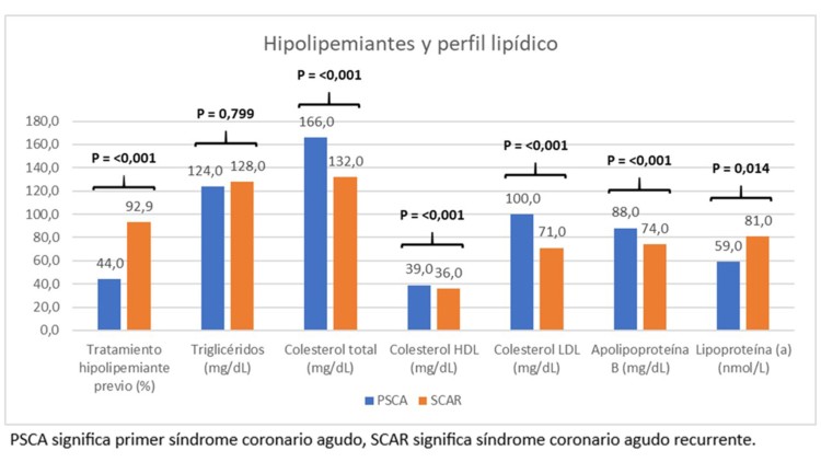 Resultados: De 580 pacientes incluidos, 453 (78%) fueron PSCA y 127 (22%) fueron SCAR. En el análisis univariante edad, sexo masculino y factores de riesgo cardiovascular tradicionales como hipertensión (HTA) y diabetes (DM) se asociaron a SCAR. Como era esperable, en el grupo SCAR la proporción de pacientes bajo tratamiento previo con hipolipemiantes fue mayor y por tanto, inferiores el colesterol total, colesterol LDL y apolipoproteína B (Figura). No hubo diferencias en los niveles de triglicéridos. Los pacientes con SCAR tuvieron cifras más bajas de HDL y mayores de Lp(a). En el análisis multivariable HTA, DM y mayor Lp(a) se asociaron de forma independiente a SCAR como factores de riesgo, mientras que sexo femenino y colesterol HDL se mostraron como factores protectores. Se observó un riesgo adicional del 15% (OR 1,15) por cada incremento de 50 nmol/l de Lp(a). En un modelo alternativo ajustado por tratamiento previo con hipolipemiantes y niveles de colesterol total y LDL, persistió la asociación entre Lp(a) elevada y SCAR [OR 1,119 (1,008-1,241); p = 0,034).