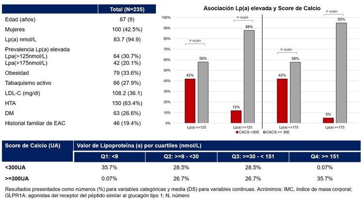 Conclusiones: La prevalencia de niveles elevados de Lp(a) en individuos con EACS es elevada, cercana a poblaciones de prevención secundaria. La Lp(a) elevada se asocia fuertemente con CACS grave, subrayando su posible papel como un factor de riesgo en la EACS, y sugiriendo su importancia en la evaluación y manejo del riesgo cardiovascular en esta población.