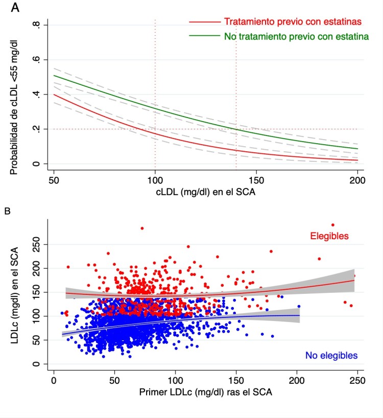 Resultados: Incluimos 3123 pacientes, con edad media 67,8 (12,6) años, 24,6% mujeres y LDLc medio en el momento del SCA 94,3 (36,5) mg/dl. El 35,1% recibían tratamiento con estatinas antes del ingreso. El 94,3% de los pacientes recibieron estatinas al alta, siendo el 87,5% de alta potencia; ezetimiba solo se recomendó en el 9,4%. La mediana de tiempo hasta la primera analítica tras el alta fue 95 días (rango intercuartílico 80-140); el 30,7% de los pacientes presentaron LDLc < 55 mg/dl en la primera determinación y estos pacientes habían recibido más frecuentemente estatinas de alta potencia (90,0 frente a 86,4; p = 0,01) y ezetimiba (15,5 frente a 6,7%; p < 0,001). Se observó una correlación entre los valores de LDLc en SCA y en la primera determinación (r = 0,41 IC95% 0,37-0,55) aunque, como se muestra en la figura A, las posibilidades de tener LDLc tras el alta < 55 mg/dl fue diferente en los pacientes que estaban tratados con estatinas o no antes del ingreso por SCA. El punto de corte de LDLc en el ingreso a partir del cual la posibilidad de tener LDLc < 55 mg/dl en la primera determinación tras el alta fue de 140 mg/dl en los pacientes que no tenían tratamiento con previo con estatinas y 95 mg/dl en los que sí. Con estos resultados el porcentaje de pacientes elegibles fue 22,5% (n = 702). Como se muestra en la figura B, la distribución del LDLc tras el alta fue claramente diferente en los pacientes elegibles frente al resto (87,6 ± 1,3 frente a 60,4 ± 25,4 mg/dl; p < 0,01).