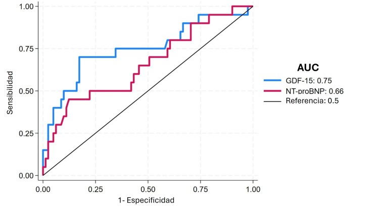 Métodos: Se realizó un estudio prospectivo, unicéntrico, incluyendo 104 pacientes con ICFEr aguda. Al ingreso, y tras obtener el consentimiento informado, se recogieron muestras de suero y plasma. Se analizaron diferentes biomarcadores, incluido GDF-15, una citocina secretada por macrófagos y cardiomiocitos en respuesta a inflamación y estrés oxidativo. Se realizó un análisis univariante de regresión de Cox para evaluar su relación mortalidad por cualquier causa y se evaluó la capacidad diagnóstica mediante curvas ROC estableciéndose puntos de corte con capacidad predictiva.