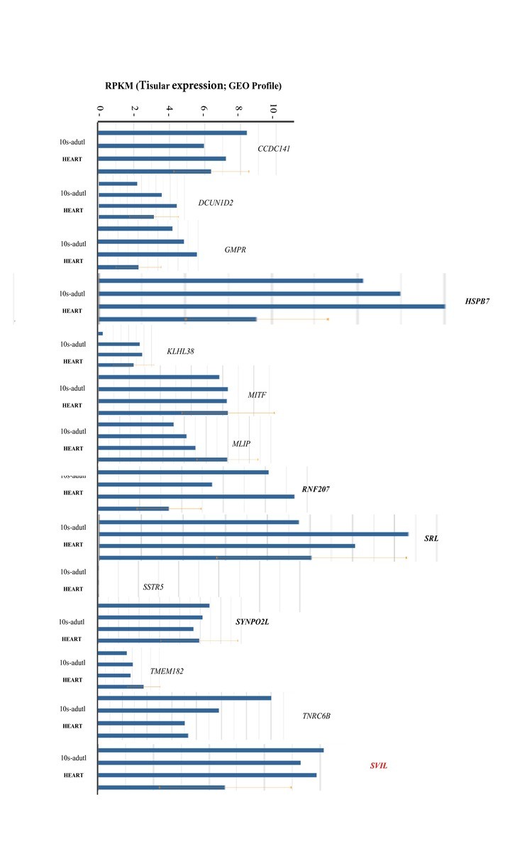 CCDC141: coiled-coil domain containing 141; DCUN1D2: defective in cullin neddylation 1 domain containing 2; GMPR: guanosine monophosphate reductase; HSPB7: heat shock protein family B (small) member 7; KLHL38: kelch like family member 38; MITF: melanocyte inducing transcription factor; MLIP: muscular LMNA interacting protein; RNF207: ring finger protein 207; SRL: sarcalumenin; SSTR5: omatostatin receptor 5; SVIL: supervillin; SYNPO2L: synaptopodin 2 like; TMEM182: transmembrane protein 182; TNRC6B: trinucleotide repeat containing adaptor 6B. |