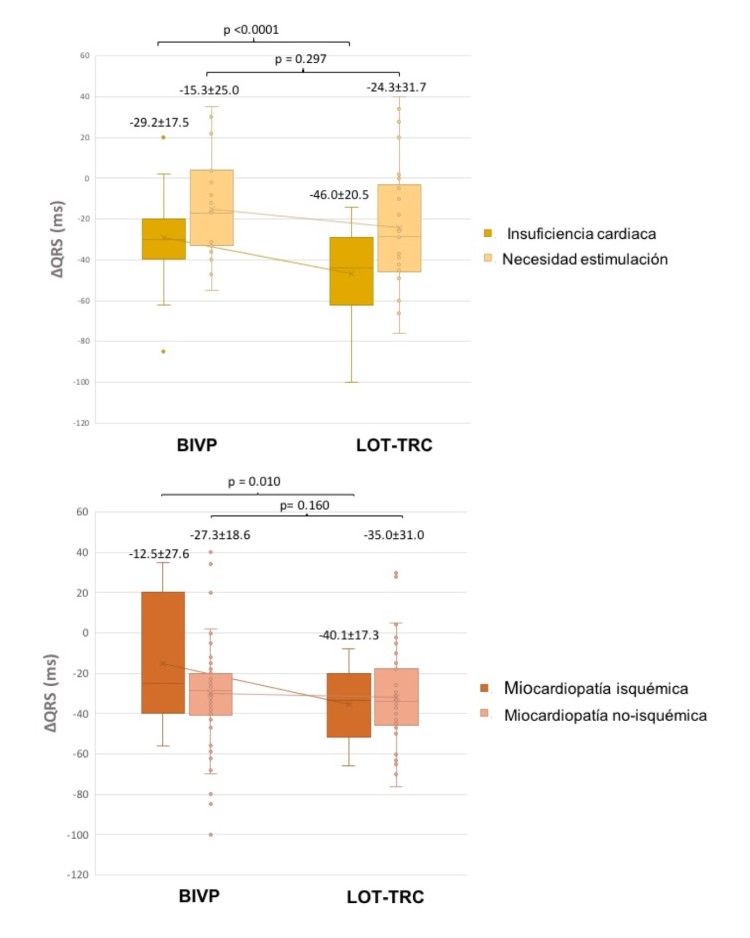Conclusiones: En indicación de resincronización por IC LOT-TRC alcanza ΔQRS superior. En miocardiopatía isquémica ΔQRS es menor que en no isquémica, pero LOT-TRC consigue un mejor resultado.