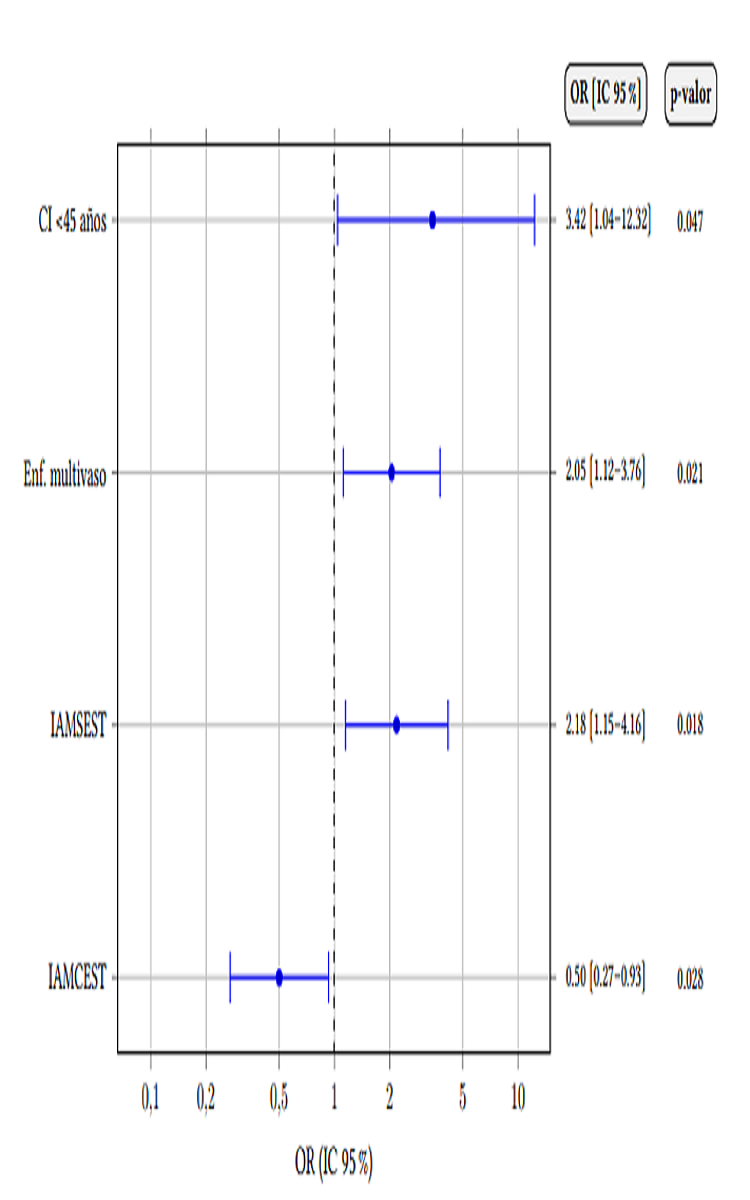 Métodos: Estudio observacional, retrospectivo y analítico, con componente transversal y longitudinal, que incluyó a pacientes consecutivos con CI atendidos en una unidad de Rehabilitación Cardiaca entre enero y diciembre de 2023. Se recogieron variables demográficas, clínicas, angiográficas y evolutivas. El análisis estadístico combinó comparaciones bivariadas y regresiones logísticas multivariables utilizando el programa SPSSv23.