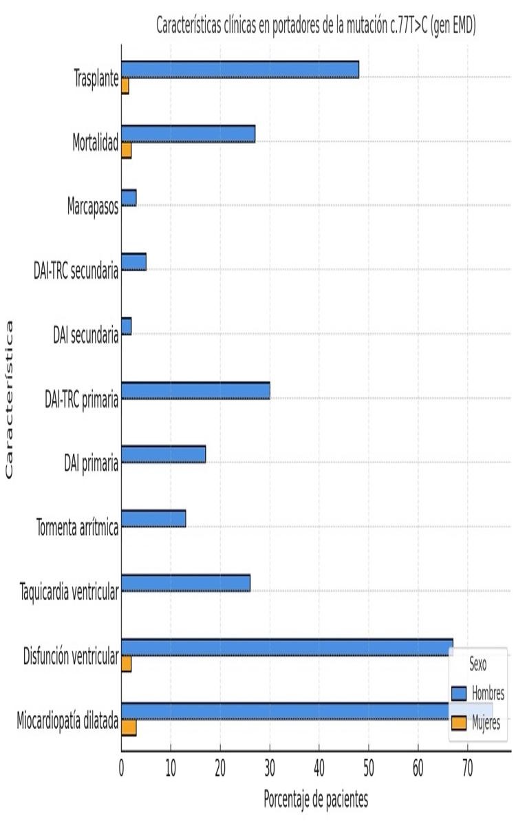 Conclusiones: La MCD por mutación en el gen de la EMD, afecta gravemente a varones, con alta frecuencia de IC, eventos arrítmicos y necesidad de trasplante. Estos hallazgos subrayan la importancia del cribado familiar y el seguimiento estrecho en esta población. En mujeres, la expresividad es menor, probablemente por menor penetrancia o por un efecto protector ligado al segundo cromosoma X.