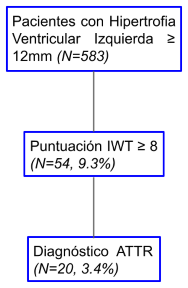 Conclusiones: La puntuación IWT en pacientes no seleccionados con hipertrofia ventricular izquierda #1 12 mm no explicada permite sospechar el diagnóstico de amiloidosis cardiaca por transtirretina, que se confirma en casi la mitad de los casos. Serían necesarios estudios futuros con mayor potencia para confirmar estos hallazgos.