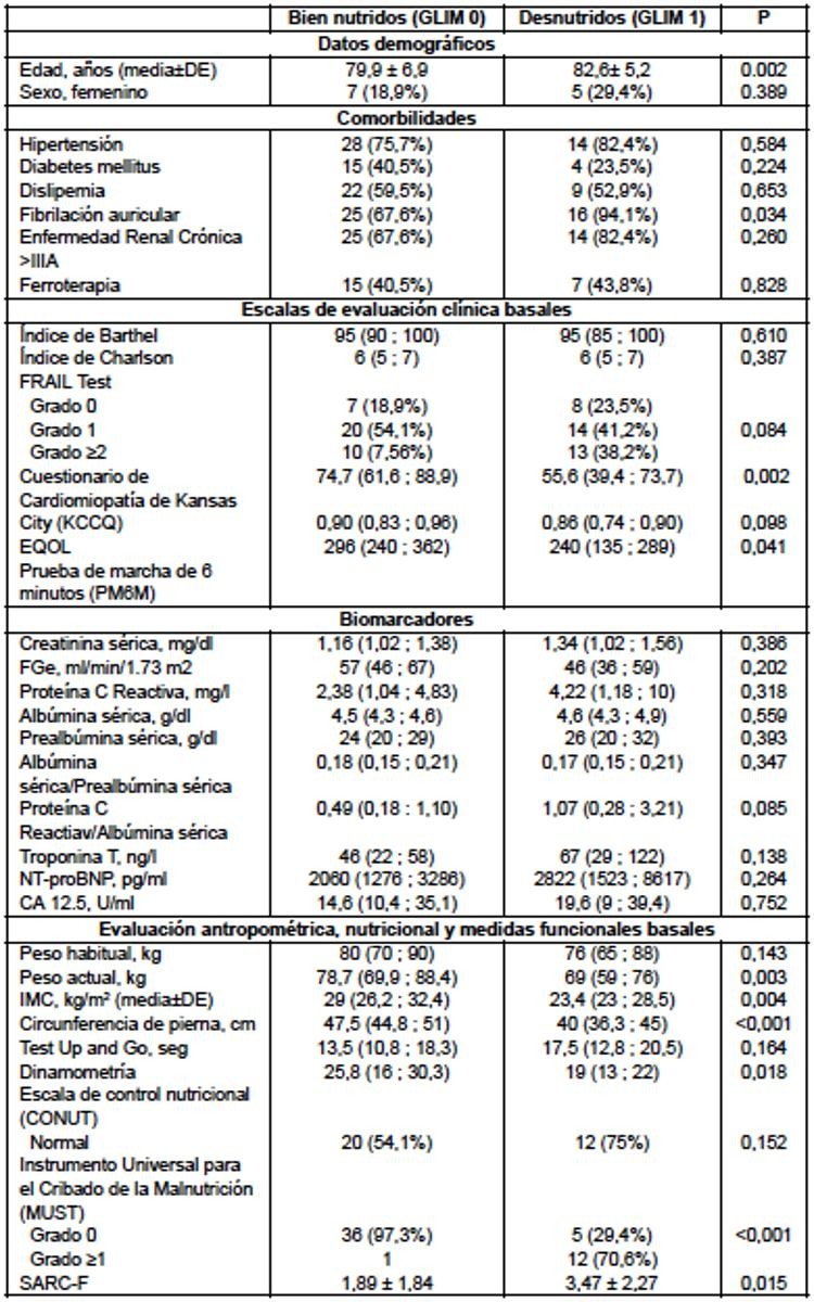Resultados: 17 pacientes (31,5%) cumplían criterios de desnutrición según según la Iniciativa Global de Liderazgo en Desnutrición (GLIM), 5 de los cuales recibieron suplementación. Las características basales se resumen en la tabla. Los desnutridos presentaron mayor prevalencia de fibrilación auricular (p = 0,034), menor puntuación en el cuestionario de Kansas City (KCCQ) (p = 0,002) y menor capacidad funcional según la prueba de marcha de 6 minutos (PM6M) (p = 0,041). Además, menor puntuación en la herramienta de cribado de malnutrición MUST (p < 0,001), mayor puntuación en la escala de sarcopenia SARC-F (p = 0,015) y reducción en medidas antropométricas (peso, IMC y circunferencia de pierna). La fuerza de prensión mediante dinamometría también fue inferior (p = 0,018). Durante el seguimiento, los bien nutridos no presentaron cambios significativos en capacidad funcional, calidad de vida ni biomarcadores. En cambio, los desnutridos que recibieron intervención nutricional mostraron mejoría en la distancia recorrida en la PM6M (p = 0,020), reducción en la escala de fragilidad clínica FRAIL (p = 0,041) y en los niveles de NT-proBNP (p = 0,035), con una tendencia a la mejoría en la dinamometría (p = 0,058).