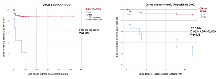 Resultados: La mortalidad fue del 16,4%, con un seguimiento mediana 76,0 [17,0-132,0] días. La prevalencia de cáncer activo al ingreso fue del 9,0%. Los pacientes con cáncer tenían una FEVI menor (p = 0,043) e inmunodepresión (p < 0,000), sin diferencias de edad, género o prevalencia de factores de riesgo. La edad (p = 0,017), el cáncer activo (p = 0,007), el índice proteína C-reactiva/albúmina (IPA; p = 0,013) y la FEVI (p = 0,028) se asociaron de forma significativa a la mortalidad, a diferencia de los parámetros clínicos, analíticos y ecocardiográficos de gravedad, p.ej.: clase Killip (p = 0,743), troponina I/T ultrasensible (0,813), péptidos natriuréticos (p = 0,203), insuficiencia mitral (p = 0,257), hipertensión pulmonar (p = 0,054), soporte vasoactivo (p = 0,414) o ventilación mecánica (p = 0,677). La mortalidad en pacientes con cáncer fue del 36,4 frente a 3,6% (test de log rank; p < 0,000). La presencia de cáncer activo se asoció a una mayor mortalidad en pacientes con STB (HR 7,187; IC95% 1,264-40,859; p = 0,026), independientemente de la edad (p = 0,018), género (p = 0,869), FEVI (p = 0,045), IPA (p = 0,020), clase Killip (p = 0,651) e infección al ingreso (p = 0,882).