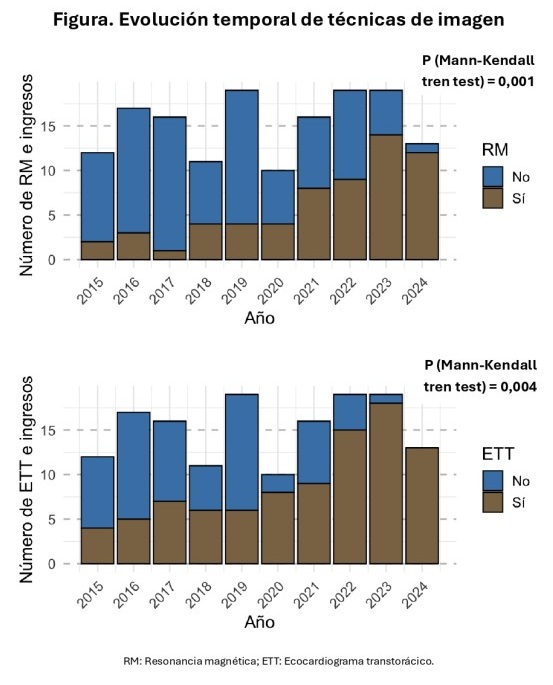 Resultados: Se incluyeron 152 hospitalizaciones por miocarditis. La incidencia se mantuvo estable en el periodo estudiado (p = 0,584), aunque se observó una mayor frecuencia de casos durante los meses de invierno en comparación con otras estaciones (p = 0,006). La mayoría fueron varones con una edad media de 27 ± 12 años, baja prevalencia de factores de riesgo cardiovascular y sin antecedentes de cardiopatía en más del 85% de los casos. No se encontraron diferencias relevantes entre ambos grupos (Tabla). El dolor torácico fue la norma de presentación más común (97,4%), sin diferencias estadísticamente significativas entre los periodos pre y pos-COVID-19 (p = 0,057). En lo referente al diagnóstico, se objetivó un incremento en la utilización de técnicas de imagen, como el ecocardiograma transtorácico (p < 0,001) y la resonancia magnética cardiaca (p < 0,001) (Figura).