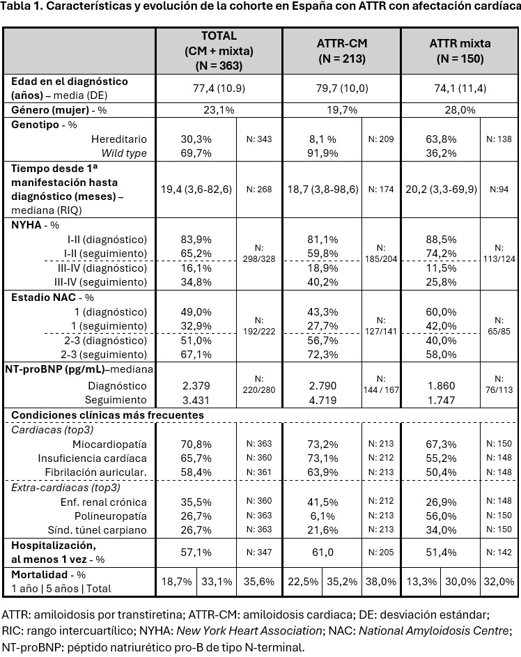 Resultados: La edad media en el diagnóstico fue de 77,4 años (desviación estándar [DE] 10,9), con 23,4% mujeres. El tipo más común de ATTR fue wild type (69,7%). En ATTR hereditaria (30,3%), mayoritariamente con fenotipo mixto, las variantes más frecuentes fueron Val50Met-late onset (53,1%) y Val142Ile (16,7%). La mediana de tiempo entre la primera manifestación clínica y el diagnóstico fue de 19,4 meses. El seguimiento medio fue de 37,8 meses (DE = 31,0). La miocardiopatía (70,8%), la insuficiencia cardiaca (65,7%) y la fibrilación auricular (58,4%) fueron las condiciones más comunes, aunque también se observó una amplia variedad de manifestaciones extracardiacas (especialmente neurológicas o de origen autonómico), particularmente en el fenotipo mixto. Durante el seguimiento, se observaron incrementos en NYHA clase III+IV (de 16,1% a 34,8%), estadio NAC 2-3 (de 51,0% a 67,1%) y NT-proBNP (de una mediana de 2.379 a 3.431 pg/ml). Además, el 57,1% necesitó hospitalización y el 35,6% falleció (36,4% por insuficiencia cardiaca), con una mortalidad de 18,7% tras 1 año y 33,1% tras 5 años desde el diagnóstico. La tabla detalla y amplía estos resultados.