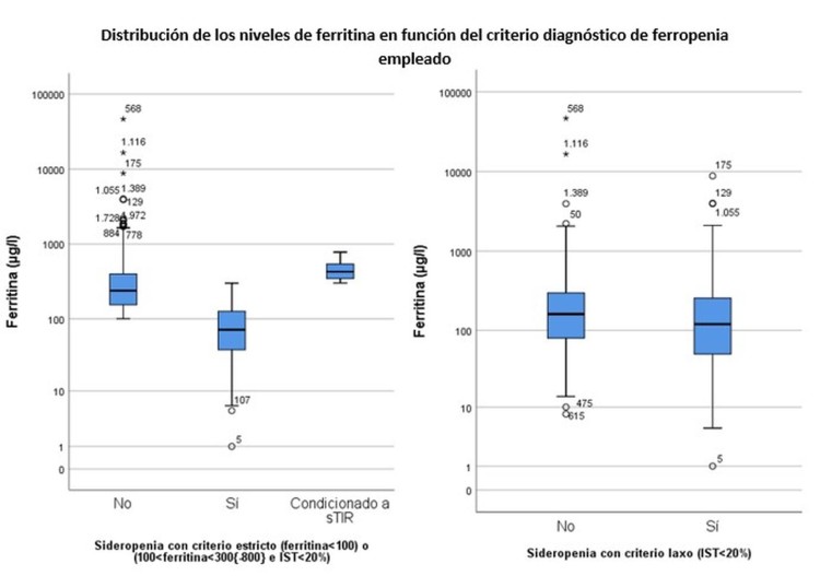 Distribución de los niveles de ferritina en función del criterio diagnóstico de ferropenia empleado.