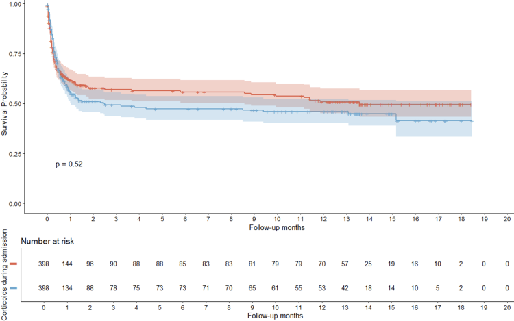 Resultados: Tras el emparejamiento mediante PSM, no se observaron diferencias significativas en la mortalidad a 18 meses (log rank p = 0,52). Tampoco se encontró una asociación significativa entre el momento de inicio del tratamiento con corticosteroides (antes o después de los 7 días desde el inicio de los síntomas) y la mortalidad.