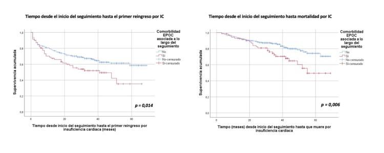 Conclusiones: La coexistencia de EPOC e IC-FEVIr supone una condición clínica frecuente, con implicaciones pronósticas relevantes. Nuestros hallazgos sugieren que la presencia de EPOC en pacientes con IC-FEVIr se asocia con un incremento significativo en el riesgo de reingresos y mortalidad por IC.
