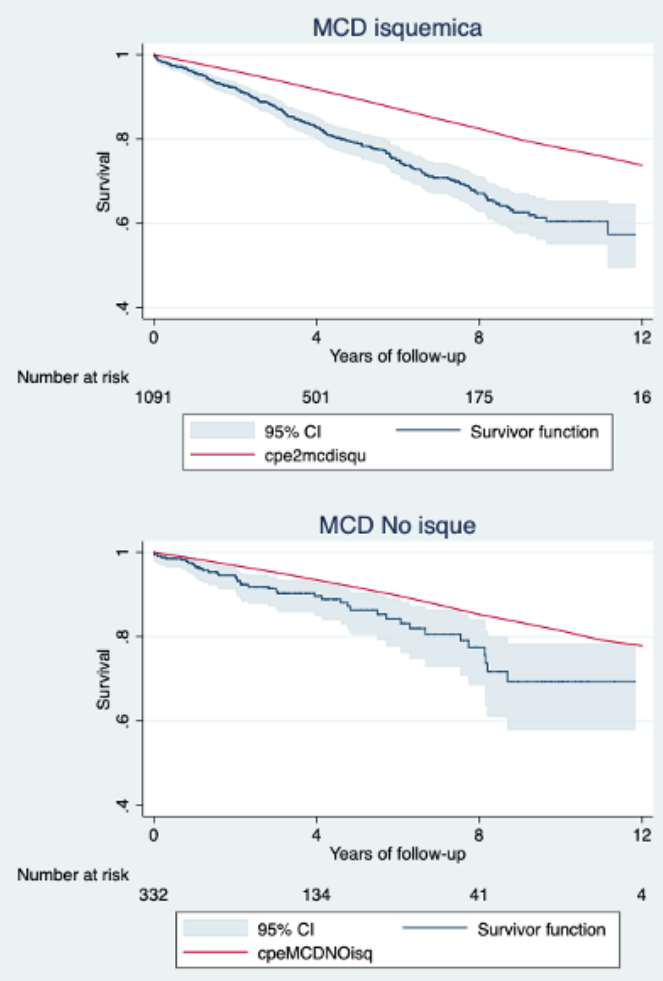 Métodos: Se llevó a cabo un estudio observacional retrospectivo en dos cohortes independientes de pacientes diagnosticados con MCD, diferenciados según su etiología en MCD isquémica (n = 586) y MCD no isquémica (n = 332). Se realizó como análisis estadístico principal una estimación de la supervivencia a 4, 8 y 12 años mediante curvas de Kaplan-Meier (Figura), calculadas con intervalos de confianza del 95%. Además, se construyeron curvas de supervivencia esperada ajustadas por edad y sexo, utilizando tablas de mortalidad poblacional. La comparación entre supervivencia observada y esperada se realizó mediante métodos indirectos de estandarización y cálculo de razones de mortalidad observada sobre esperada.