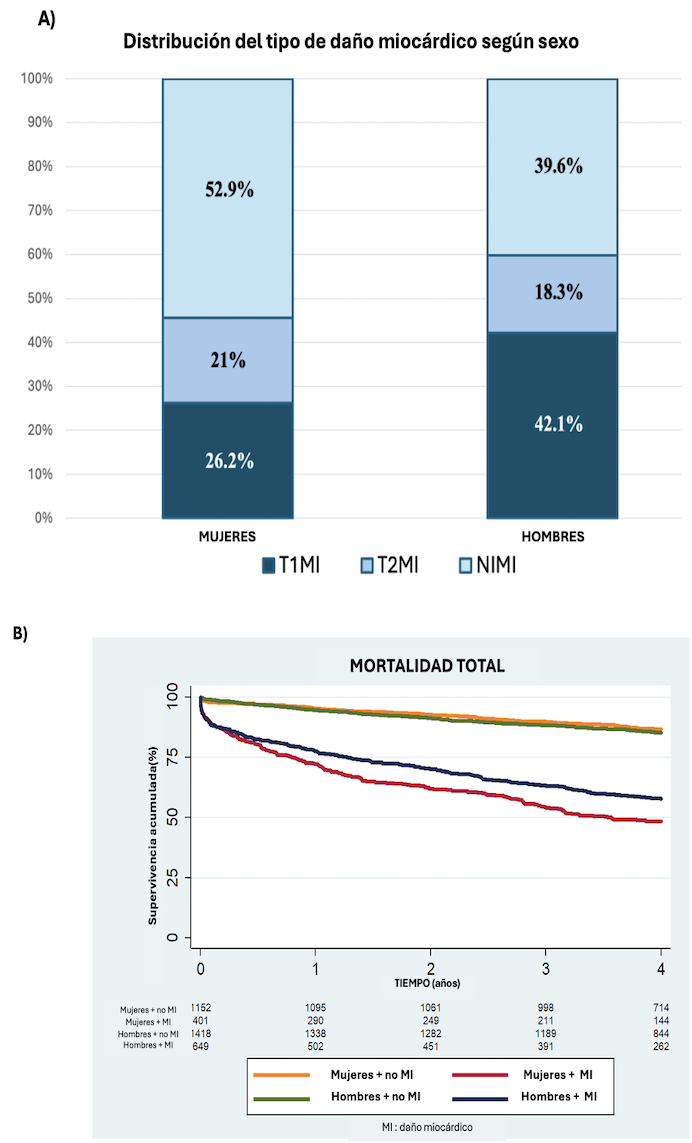 Conclusiones: El pronóstico del daño miocárdico difiere según sexo: las mujeres presentan mayor riesgo de IM e IC, y los hombres mayor riesgo de mortalidad.