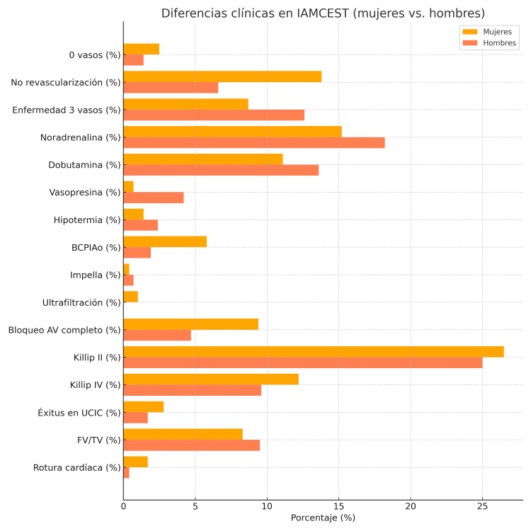 Métodos: Se realizó un análisis retrospectivo de 1.840 pacientes menores de 70 años con IAMCEST ingresados en la UCIC entre 2012 y 2025, divididos en mujeres (M, n = 281) y varones (V, n = 1.559), evaluando diferencias clínicas y evolutivas.