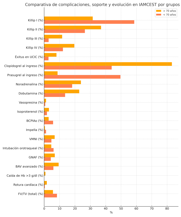 Comparativa de complicaciones, soporte y evolución en mujeres con IAMCEST mayores de 70 años y menores de 70 años.