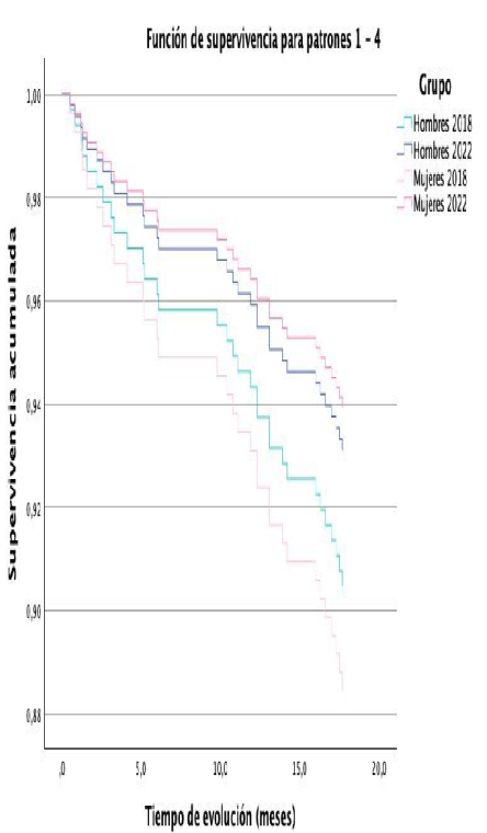 Métodos: Se realizó un estudio con pacientes dados de alta tras un SCA en 2018 (preintervención) y 2022 (posintervención). La variable principal fue la mortalidad cardiovascular a 18 meses. Las secundarias incluyeron el control del colesterol LDL y la HbA1c. Los análisis se estratificaron por sexo y se evaluó la supervivencia mediante curvas de Kaplan-Meier, regresión de Cox y comparación de reducciones relativas del riesgo.