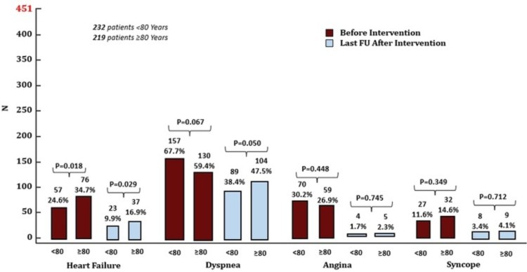 Conclusiones: Los pacientes con EAg presentan diferencias propias relacionadas a la edad: mayor comorbilidad, síntomas más avanzados y mayor susceptibilidad a complicaciones. Los #1 80 años mejoran de angina y síncope igual que los jóvenes, pero no tanto de la disnea ni de la IC, que son los síntomas más frecuentes y con mayor persistencia en ambos grupos de edad, y su pronóstico es peor, principalmente por causas no cardiológicas. Se requieren estrategias para detectar por qué persisten estos síntomas y cuáles son los pacientes que más se benefician de estos procedimientos.