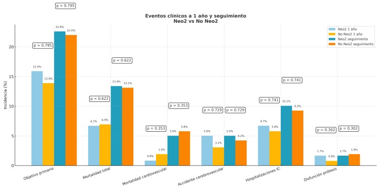 Resultados: Sin diferencias en las características basales. Expansión adecuada en el 86,3%; 13,7% infraexpandidos, 5 posdilatados en el procedimiento, en 12 casos no fue detectada inicialmente. Características y complicaciones del procedimiento (Tabla). Predilatación más frecuente con Neo2 (99,3 frente a 76,4%, p0,001) y posdilatación menor (4,8 frente a 13,2%, p0,017). En No Neo2 mayor necesidad de marcapasos (20,8 frente a 6,4%, p0,001), sin diferencias en el resto de resultados hospitalarios. Sin diferencias en los gradientes medios transvalvulares posimplante (10,3 mmHg frente a 9,8 mmHg, p 0,549) ni en el seguimiento (9,6 mmHg frente a 9,2 mmHg, p0,858). Sin diferencias en la incidencia de insuficiencia periprotésica significativa al alta (6,1 frente a 5,9%, p 0,95) ni en el seguimiento (9,3 frente a 7,1, p0,48). En el seguimiento, no diferencias en eventos clínicos entre grupos (imagen), en el subgrupo de la Neo2 que quedaron infraexpandidos no se registró ningún evento significativo ni disfunción valvular.