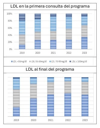 Resultados: Se registraron un total de 932 pacientes (edad media: 59,4 ± 6,7años; 18% mujeres). El porcentaje de pacientes con niveles LDL objetivo en la primera consulta fue mayor a lo largo de los años: 12,27% en 2019, 25% en 2021 y 33% en 2023. El ajuste terapéutico más frecuente fue la incorporación de ezetimiba, prescrita en el 37% de pacientes al alta hospitalaria y en el 83% al finalizar el programa. Se observó un aumento significativo en el uso de ezetimiba e inhibidores de PCSK9. El porcentaje de pacientes que alcanzaron el LDL objetivo al término del programa fue progresivamente mayor: 46% en 2020, 55% en 2023. A destacar que, en 2023, un 33% de los pacientes presentó niveles de LDL entre 55 y 70 mg/dl y menos del 2% > 100 mg/dl.