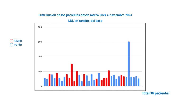 Resultados: Se incluyeron un total de 38 pacientes en prevención secundaria tras presentar un síndrome coronario agudo y ser derivados a la unidad de rehabilitación cardiaca. Del total de pacientes, el 38,5% fueron mujeres y la media del LDL colesterol fue de 146,56 ± 86,44 mg/dl en el momento de la prescripción del inclisirán. En mujeres se consiguieron descensos menos importantes del LDL colesterol, incluso en aquellas que recibían tratamiento concomitante con estatinas o ácido bempedoico. También observamos que al inicio del estudio los valores basales de LDL colesterol eran más bajos en mujeres, comparado con los varones, con menor uso de otros fármacos para el control del colesterol.