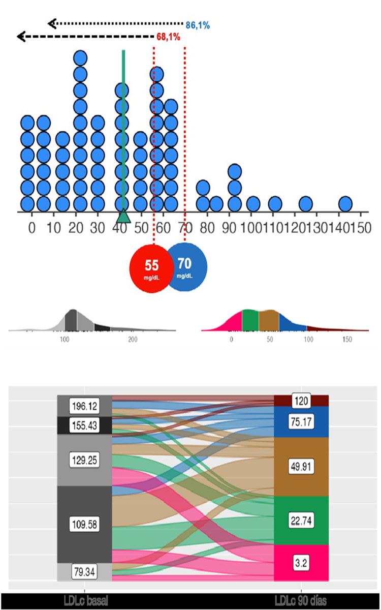 Resultados: Se incluyó a 72 pacientes, con una edad media de 65,7 años (44-84), un 27,8% mujeres. El 23,6% eran intolerantes a estatinas; el resto recibió estatinas (61,2% de alta intensidad), 12,5% ácido bempedoico y 80,6% ezetimiba. El 24,2% eran fumadores, el 25,6% diabéticos, y el 64,8% habían experimentado un primer evento coronario. Dos pacientes que previamente recibían anticuerpos monoclonales anti-PCSK9 cambiaron a inclisirán por conveniencia, y un paciente abandonó el tratamiento. El tratamiento con inclisirán produjo una reducción media del cLDL de 84,4 ± 35,1 mg/dl, correspondiente a una disminución media del 67,3%. El 68,1% alcanzó el objetivo de cLDL < 55 mg/dl, mientras que el 86,1% logró el objetivo de < 70 mg/dl. Los pacientes con terapia concomitante con estatinas tuvieron una bajada del LDLc de 91 mg/dl (74,6%), mientras en los que no tenía estatinas la bajada fue de 56 mg/dl de media (48,6%). No se observaron cambios significativos en la creatina quinasa (CK) ni en transaminasas hepáticas, y no hubo eventos adversos relacionados con el tratamiento.