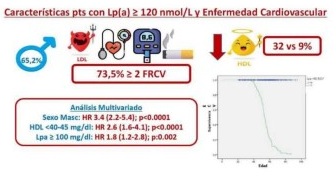 Conclusiones: En pacientes con Lp(a) elevada (#1 120 nmol/l), el desarrollo de ECV se asocia significativamente a ser hombre, presentar niveles bajos de HDL-c, valores de Lp(a) #1 240 nmol/l, y una mayor carga de FRCV. Estos hallazgos subrayan la relevancia de la Lp(a) en la estratificación del riesgo CV y abogan por una intervención más intensiva de los FRCV, considerando la potencial utilidad del AAS a bajas dosis en pacientes con estas características para la prevención de ECV.