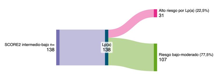 Conclusiones: La medición de Lp(a) permitió identificar a sujetos con riesgo cardiovascular subestimado por SCORE2. Aproximadamente una cuarta parte de los pacientes de riesgo basal bajo/moderado presentaban Lp(a) elevada y se reclasificaron a riesgo alto. Estos hallazgos respaldan la relevancia de incorporar la Lp(a) en la estratificación del riesgo cardiovascular para optimizar la prevención.