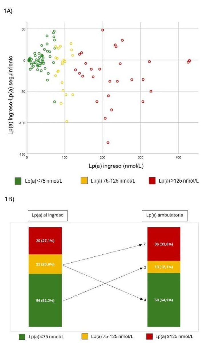 Resultados: Se incluyeron 107 pacientes; edad: 65,5 ± 11,9 años; 20,6% mujeres. La mediana de Lp(a) en la analítica de ingreso fue: 72 [32-139] nmol/l, mientras que en el seguimiento fue: 61 [29-160] nmol/l (p = 0,024). Respecto al ingreso, Lp(a) a las 4-6 semanas subió en 62 pacientes, bajó en 39 y fue similar en 6. La mediana de variación absoluta fue 14 [4-32] nmol/l. No se observó asociación entre una variación > 14 nmol/l y edad, diabetes, tratamiento previo con estatinas, tipo de SCA, ni PCR. La variación fue mayor cuanto mayor eran los niveles durante el ingreso: 8 [3-17] nmol/l en el grupo de < 75 nmol/l; 19 [5-42] en el de 75-125 nmol/l; 26 [11-51] nmol/l en pacientes con > 125 nmol/l (p < 0,001). En el grupo > 125 nmol/l (29 pacientes; 27,1%), ningún paciente fue reclasificado de riesgo en la analítica de seguimiento. De los 56 pacientes (52,3%) con Lp(a) < 75 nmol/l al ingreso, dos (3,5%) fueron reclasificados al grupo intermedio. El grupo que presentó más reclasificaciones fue el de Lp(a) 75-125 nmol/l (22 pacientes; 20,6%): 4 pacientes (18,2%) pasaron a riesgo bajo y 7 al alto (31,8%).