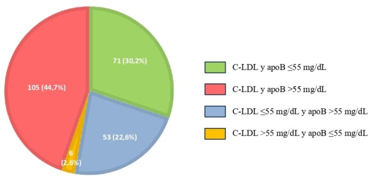 Distribución de los pacientes según el objetivo terapéutico de 55 mg/dl de C-LDL y apoB. C-LDL: colesterol contenido en lipoproteínas de baja densidad; apoB: apolipoproteína B.