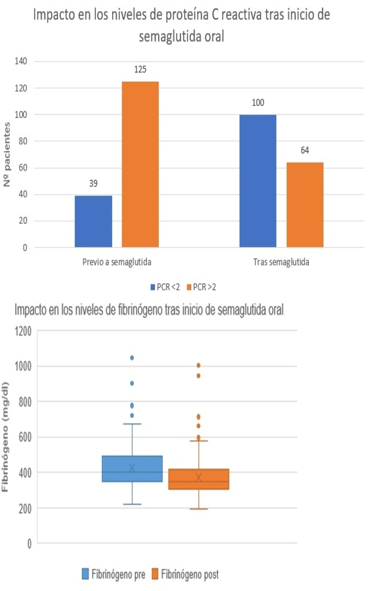 Resultados: Se incluyeron un total de 164 pacientes (edad media 68 ± 9 años, 37,6% mujeres. El 70% recibieron dosis de semaglutida 7 mg. Las principales características se recogen en la tabla. Tras un seguimiento medio de 370 ± 42 días, el 10,4% interrumpió el tratamiento, predominantemente por causa gastrointestinal. 13 pacientes (7,9%) experimentaron un evento CV mayor. El tratamiento con semaglutida redujo significativamente los niveles de PCR en el seguimiento (pre 6,69 ± 9,05 mg/l frente a post 2,87 ± 6,13 mg/l) y fibrinógeno (pre 428 ± 130 mg/dl frente a post 370 ± 113 mg/dl) (Figura). En el análisis multivariante, el tratamiento con semaglutida fue predictor independiente de reducción sostenida de PCR en el seguimiento (HR 3,55; IC95% 1,39-9,06; p0,008), junto con los niveles de PCR previos (HR 1,15 IC95% 1,06-1,24, p < 0,001).