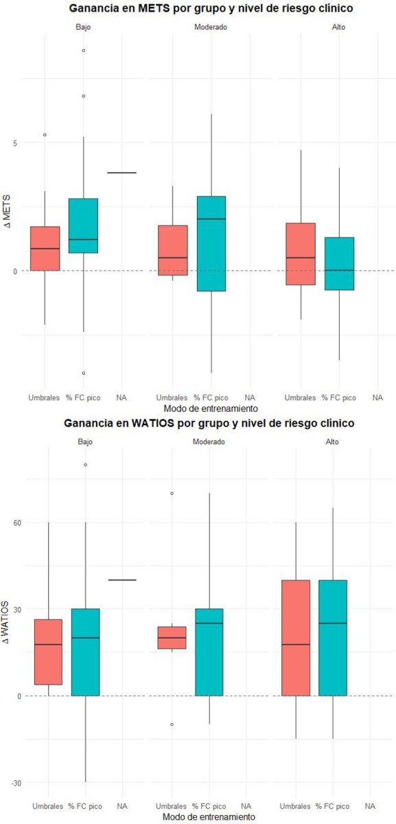 Boxplot de ganancia funcional estimada en METS y watios tras rehabilitación cardiaca según el método de prescripción del entrenamiento y nivel de riesgo clínico.