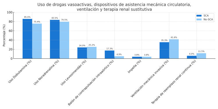 Uso de fármacos vasoactivos, dispositivos de asistencia mecánica circulatoria, ventilación y terapia renal sustitutiva.