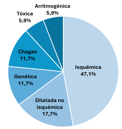 Resultados: Se incluyeron en el estudio 39 pacientes. El 56 % fue derivado de forma programada desde consulta. 17 pacientes fueron incluidos en lista de espera para trasplante cardiaco, 8 rechazados (7 por comorbilidades y 1 por fallo multiorgánico), 2 remitidos a cirugía con necesidad de soporte circulatorio en el posoperatorio y 1 para asistencia circulatoria como puente a trasplante por hipertensión pulmonar. En el resto de los pacientes se optó por seguimiento clínico. Los pacientes en lista de espera tenían una edad media de 54 años y un 76,5% eran varones. La etiología más frecuente fue la cardiopatía isquémica (imagen). En el momento de la derivación, el 82,3% se encontraba en clase funcional III de la NYHA y un 35,3% había tenido más de dos descompensaciones el último año. Las características basales de la muestra se recogen en la tabla. En el momento del análisis, el 82,3% de los pacientes incluidos en lista habían sido trasplantados, siendo el 28,5% de forma urgente. Un 21,4% se encontraba en shock cardiogénico y requirió ventilación mecánica pretrasplante. El 35,3% precisó asistencia circulatoria pretrasplante (4 asistencia biventricular, 1 HeartMate 3 y 1 Impella CP). La supervivencia fue del 100% en el momento del trasplante y al año del seguimiento.