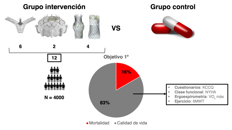 Resultados: De los 12 estudios incluidos, 6 evaluaron técnicas de reparación (TRILUMINATE, TRI.FR, CLASP-II TR, DRAGONFLY-T, TRACE-NL y TRICI-HF), 2 evaluaron prótesis ortotópicas (TRISCEND-II y TRISCEND-III) y 4 prótesis heterotópicas (TRICAVAL, TRICUS EURO, TRICAV y TRICAV-II). Las características de metodológicas de los estudios quedan resumidas en la tabla. Todos los estudios utilizan tratamiento médico como grupo control. Ninguno compara frente a cirugía, lo cual limita la capacidad de evaluar superioridad terapéutica real. Solo 2 estudios (TRILUMINATE y TRISCEND-II) utilizaron un objetivo primario jerárquico que priorizaba la mortalidad sobre reintervención, hospitalizaciones por insuficiencia cardiaca y en último lugar la calidad de vida. En los 9 estudios restantes, el objetivo primario fue compuesto, priorizando medidas de calidad de vida mediante la escala Kansas City Cardiomyopathy Questionnaire (KCCQ), clase funcional (NYHA) o capacidad de ejercicio (VO2 máx, 6MWT), sin que sean los eventos duros como mortalidad el parámetro principal.