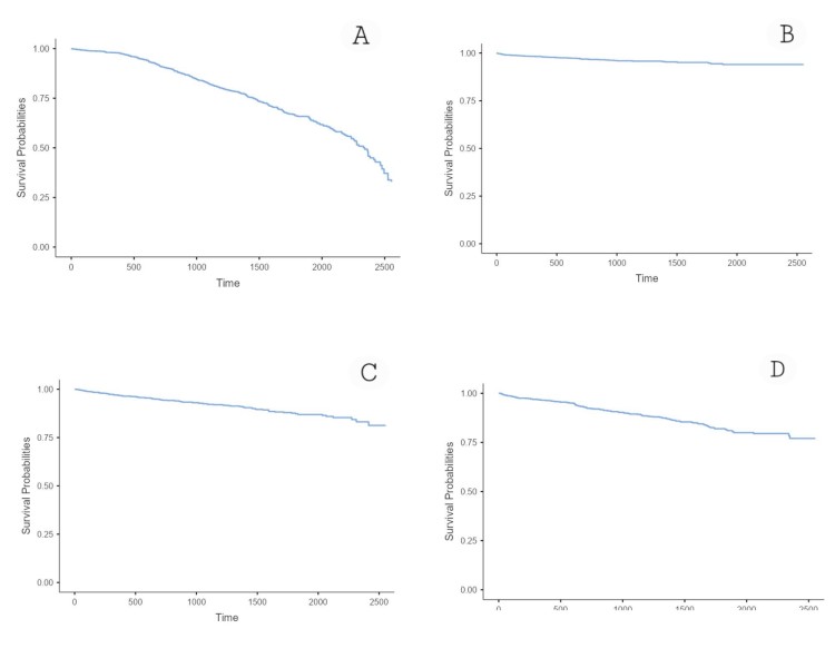 Curvas de supervivencia (Kaplan Meier), en función de: A. Mortalidad por todas las causas; B. Mortalidad causa CV; C. Mortalidad causa no CV; D. Mortalidad causa desconocida.